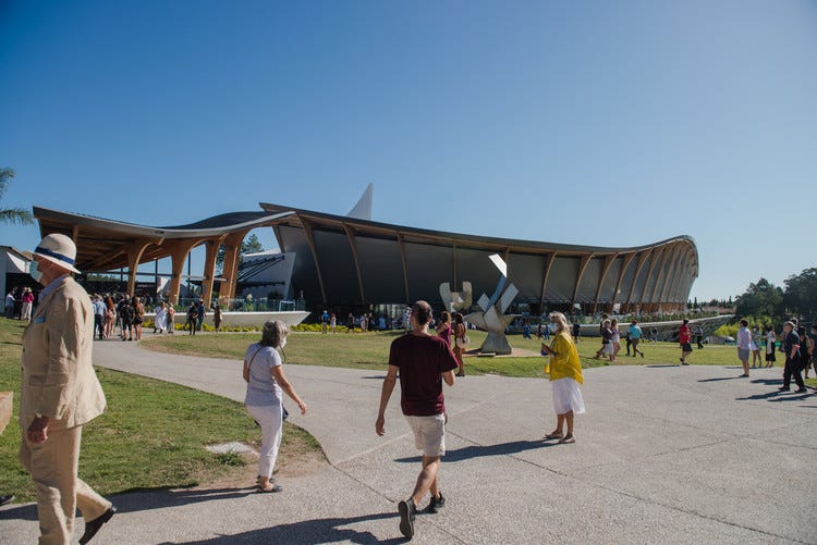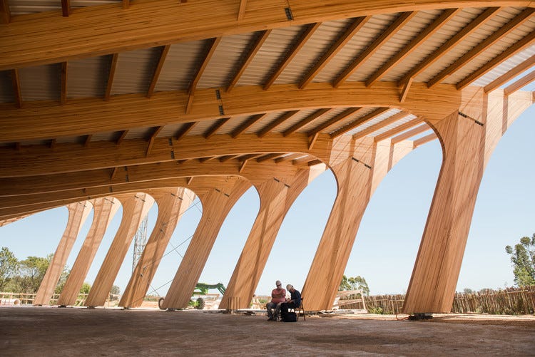 The structure of the sculpture’s hall stands out. It has a double-curved roof supported by a set of glued laminated timber supports manufactured in Europe with locally sourced wood (red grandis eucalyptus).